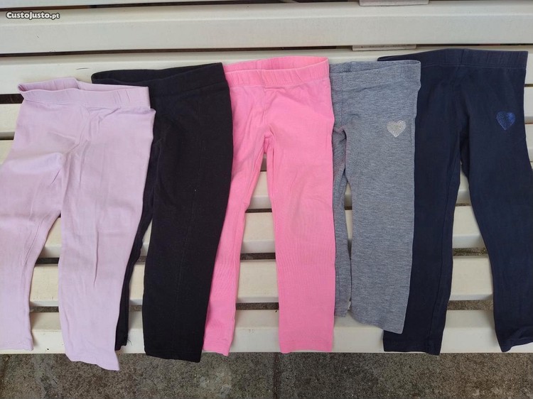 As calças são das marcas Chicco (as de cor violeta, rosa, cinzenta clara e azul escura) e H&M (as de cor preta).