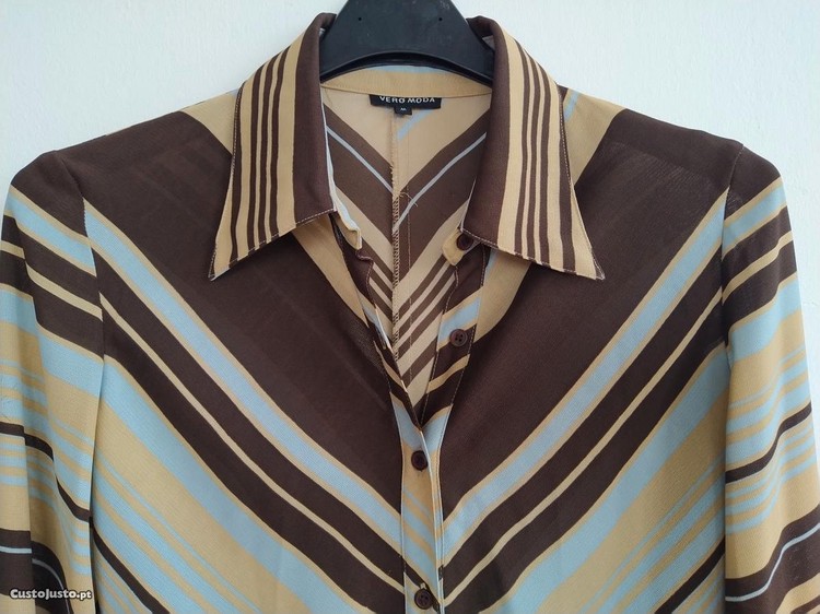 Blusa da Vero Moda com padrão de riscas castanhas, cremes e azuis claras, muito elegante e em estado irrepreensível, conforme se pode verificar pelas fotos.