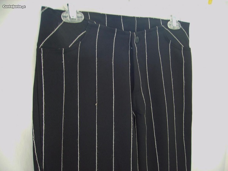 Calças pretas às riscas brancas, muito originais e bonitas! Têm dois bolsos à frente e dois bolsos atrás e fecham com um fecho e um botão!