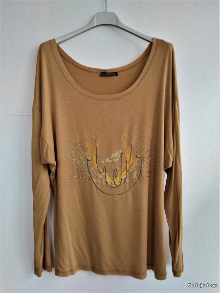 Bonita camisola camel com desenho e brilhantes, da marca Fashion House, assenta muito bem! Tamanho XL, em excelente estado!