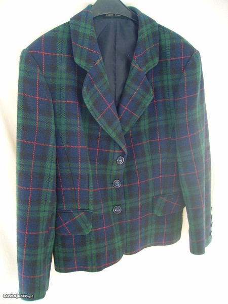 Casaco / Blaser quadriculado de cor azul, verde e vermelho, muito elegante e bonito! Tem manga comprida e uma fila de quatro botões em cada lado dos punhos. Fecha com três botões e tem um bolso em cada lado, na frente.