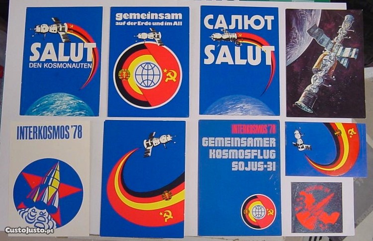 Vendo colecção de sete postais e dois autocolantes alusivos à missão espacial Soyuz 31/Interkosmos'78.