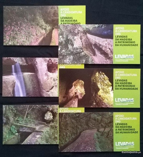 Vendo conjunto de seis postais de apoio à candidatura das Levadas da Madeira a Património da Humanidade, emitidos pelo Partido Ecologista "Os Verdes" em 2015, com fotos da autoria de David Francisco de belas paisagens deste sistema de irrigação característico da Ilha da Madeira.