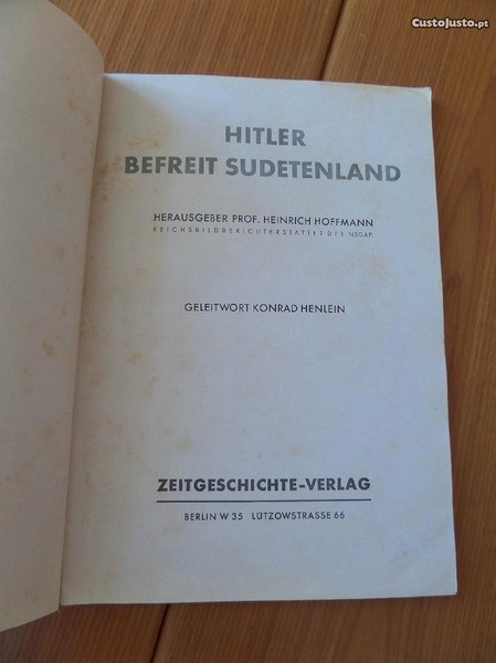 Vendo livro "Hitler befreit Sudetenland" (ou "Hitler libertando os Sudetas", na tradução literal em Português), um álbum fotográfico de propaganda nazi sobre o processo que levou à anexação pelo III Reich da região dos Sudetas, na então Checoslováquia, em 1938, desde a alegada perseguição aos habitantes daquela zona de maioria germânica (que serviu de fundamento para as exigências alemãs), passando pela Conferência de Munique até à invasão e consequente anexação. Muitas fotos de Hitler e outros destacados dirigentes nacional-socialistas em visita às populações e às tropas invasoras, algumas das quais da autoria de Heinrich Hoffmann, fotógrafo pessoal e oficial de Adolph Hitler.