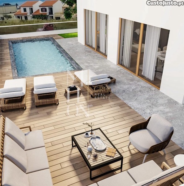 O exterior conta com uma zona de lazer e piscina.