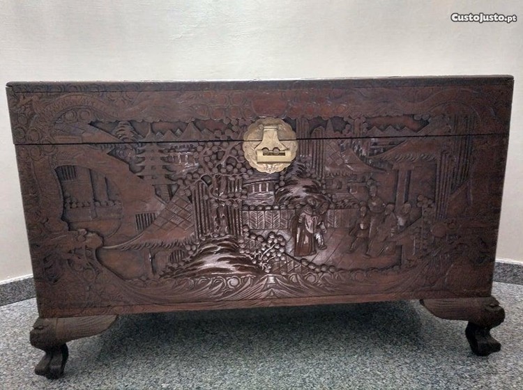 Arca chinesa de madeira de cânfora com gravuras em baixo-relevo, ainda com respetivo fecho e chaves, encontra-se em excelente estado de conservação.