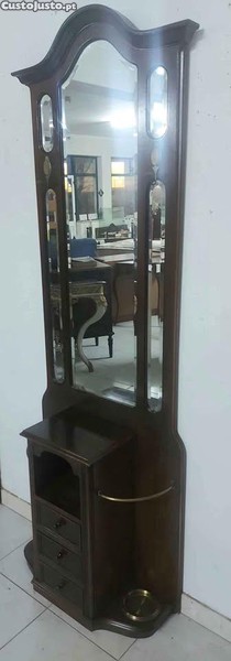 Magnífico móvel de entrada em mogno com espelho grande, três gavetas, ganchos para roupas e dois porta-guarda-chuvas. Mede 2 m de altura x 68 cm de largura x 28 cm de profundidade. Recolha em Vila Boim. Este móvel de entrada usado possui um design elegante e clássico, com um espelho emoldurado e gavetas para armazenamento. É uma peça versátil que pode ser usada na entrada, corredor ou mesmo em um quarto. Seu estado usado indica que pode ter alguns sinais de uso, mas ainda é uma opção interessante para quem busca um móvel de entrada funcional e com estilo.