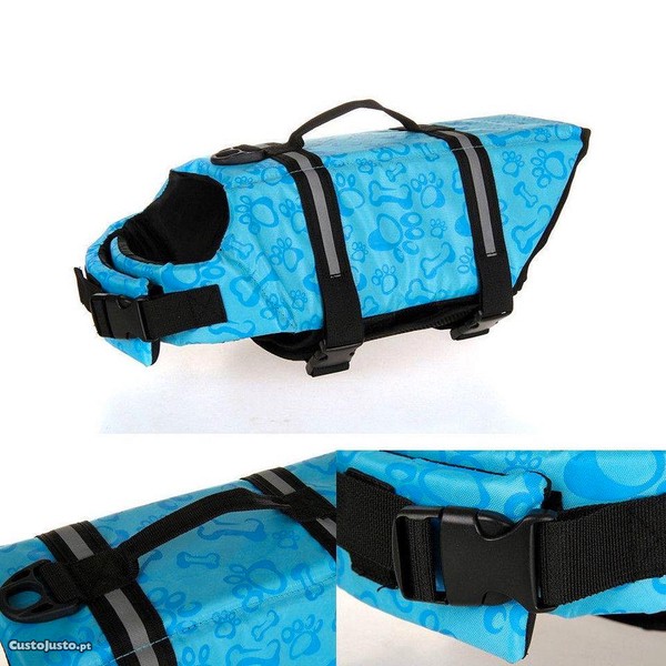 - Colete de cor azul com padrão de patinhas e ossinhos.