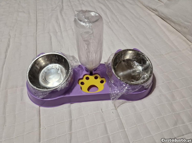 Dispensador de água no centro com cerca de 500 ml, dois comedouros bilaterais com tigelas metálicas inoxidáveis.