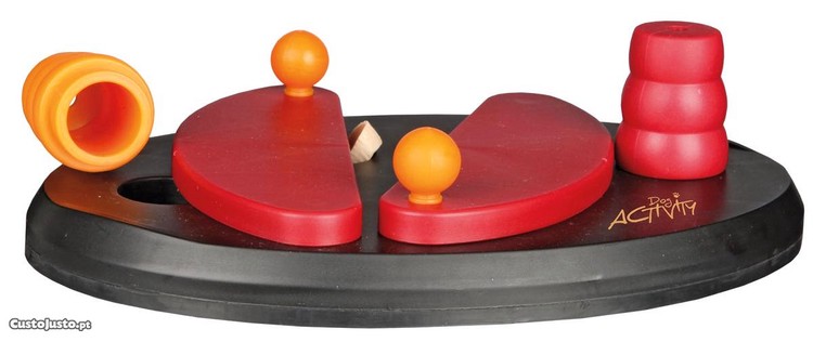 Especialmente indicado para cães pequenos Movendo as tampas o cão obtém a sua recompensa Tabuleiro com 2 cones e 2 tampas com cavidades inferiores Usando os cones como freios pode aumentar o grau de dificuldade Plástico Anti-derrapante, graças aos pés em borracha Inclui livro com instruções e dicas para um ótimo treino