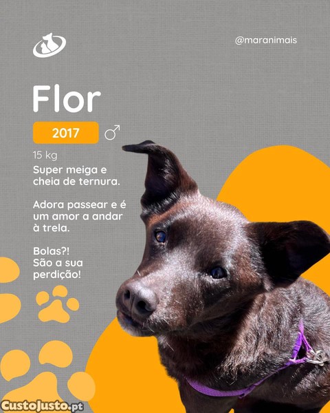 A Flor é uma cadela excecional. É extremamente meiga, pensativa, carinhosa e bondosa. Não é só uma boa menina: é única e de coração muito sensível. Carrega no olhar demasiada tristeza