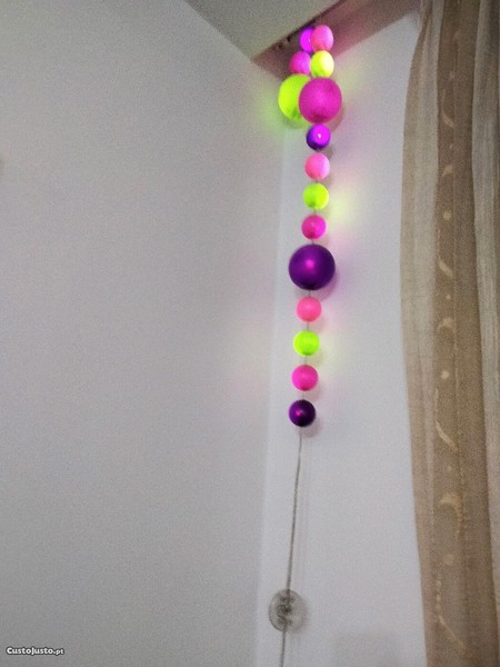Candeeiro rosa em formato de bolas para pendurar no quarto do bebê. Contém várias cores, com interruptor para ligar e desligar.