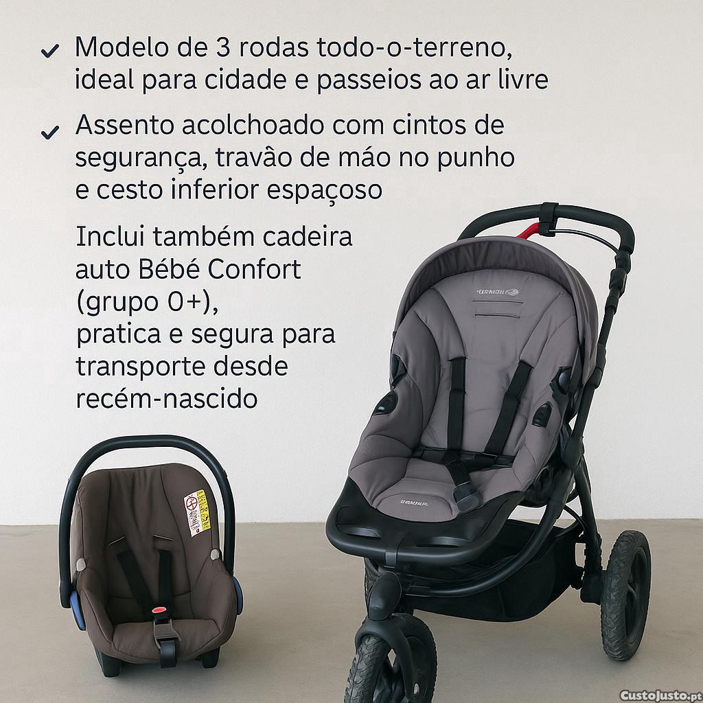 Inclui também cadeira auto Bébé Confort (grupo 0+), prática e segura para transporte desde recém-nascido.