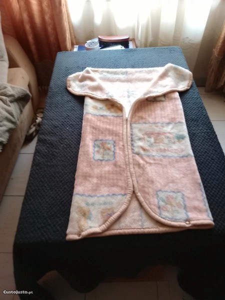 Tem fecho que fecha ao meio, servindo de agasalho para o bebé em várias ocasiões