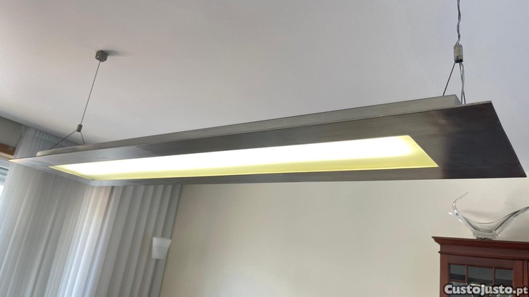 Candeeiro desenhado por arquiteto, suspenso por cabos de aço, em inox, escovado com 2 luminárias florescentes. Medidas, 178, 40, 0,7 cm.