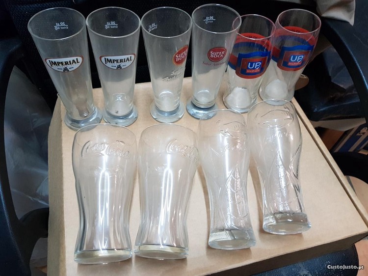 Conjunto de dez copos em vidro. Dois Superbock, dois Imperial, dois Up, dois Cocacola, dois, Lipton (Tea). Não estão esmurrados.