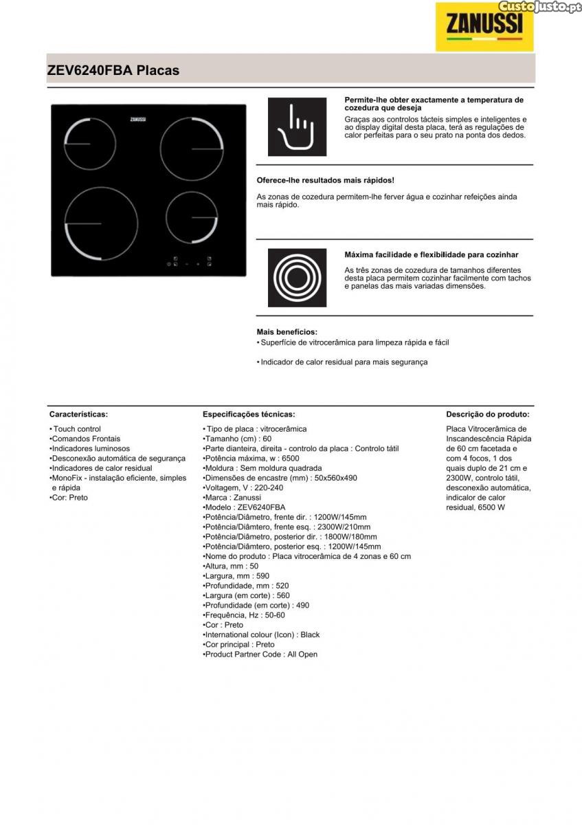 Placa Vitroceramica ZANUSSI para peças, ainda que apresente o vidro temperado estalado na vertical
