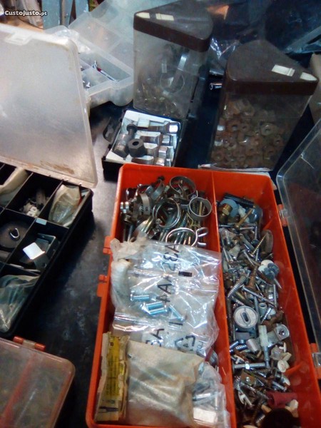 Diversas caixas com parafusos e roscas, abraçadeiras e mais...