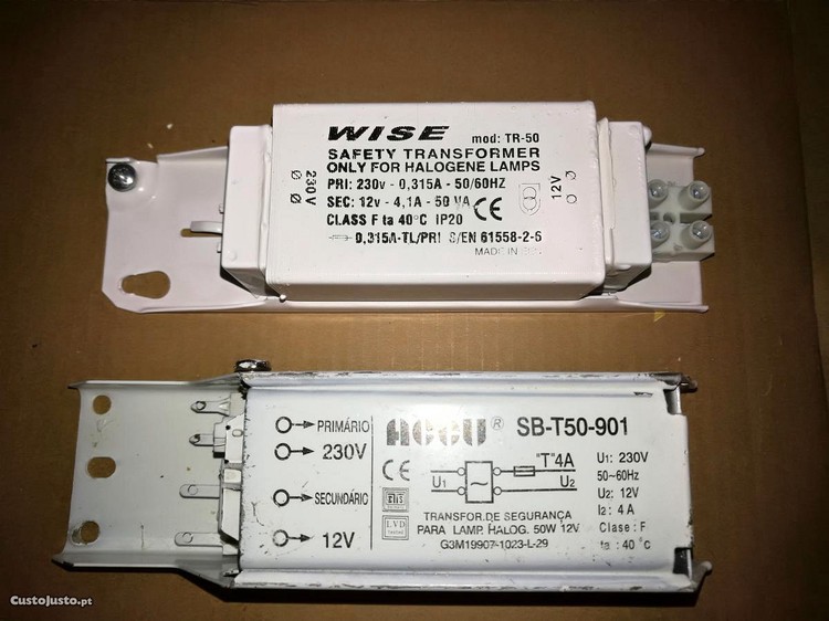 Transformadores Ideais para lâmpadas encastraveis em tetos falsos do tipo MR11 ou MR16 GU5.3 ou GU10, halogéneo, 50W.