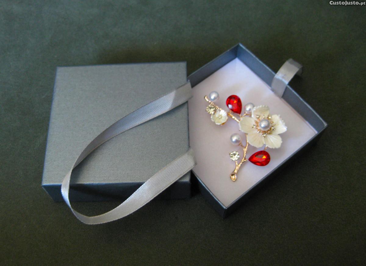 Alfinete / Broche / Pregadeira Ramo c/ Perolas e Pedras Vermelhas NOVO