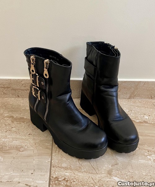De cor preta, estilo pele. Com fitas e fechos dourados. Um dos fechos serve para alargar para calçar mais facilmente a bota (ver fotos). Salto com cerca de 7 cm de altura no calcanhar.