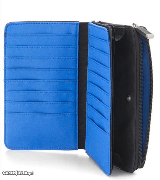 Fecha com elástico e com ziper, tem espaço para 16 cartões, bolsa com ziper para moedas e outra com fecho de mola. O interior é de cor azul.