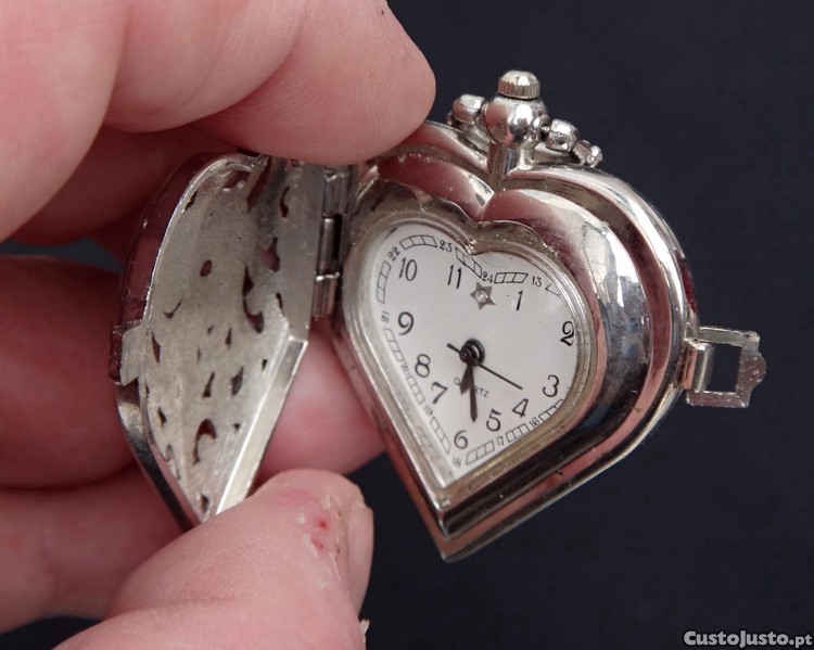 Colar com relógio em forma de coração, decorativa, material prata solido