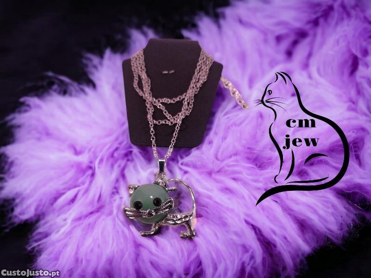 Colar corrente, com gato em pedra verde claro, corrente com 52cm + 5cm de extensão,completamente novo, hand made, por 4EUR+ portes de envio ou passando a levantar em Rio Tinto junto à igreja matriz.