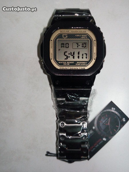 G-Shock (Skyline) All Black Todo em Aço Face Dourada - modelo igual ao novo G-Shock GMW-B5000D todo em aço que custa 500,00 EUR mas este muito mais barato. - Relógio todo em aço. - Data. - Alarme. - Cronómetro. - Luz. - Bracelete aço inox com fecho de segurança. - À prova de água 30M - Caixa: 43 mm - Tampa de trás da caixa de rosquear.