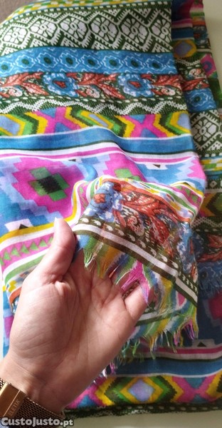 Em tecido leve e fluido e com acabamento com franjas. Acresce portes.