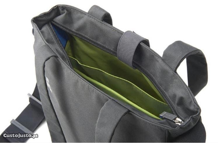É impermeável, tem duas asas de mão/ombro e uma de tiracolo ajustável (que se encontra num bolso lateral), o interior é forrado em duas cores - azul e verde - e tem espaço para um portátil de 13''.