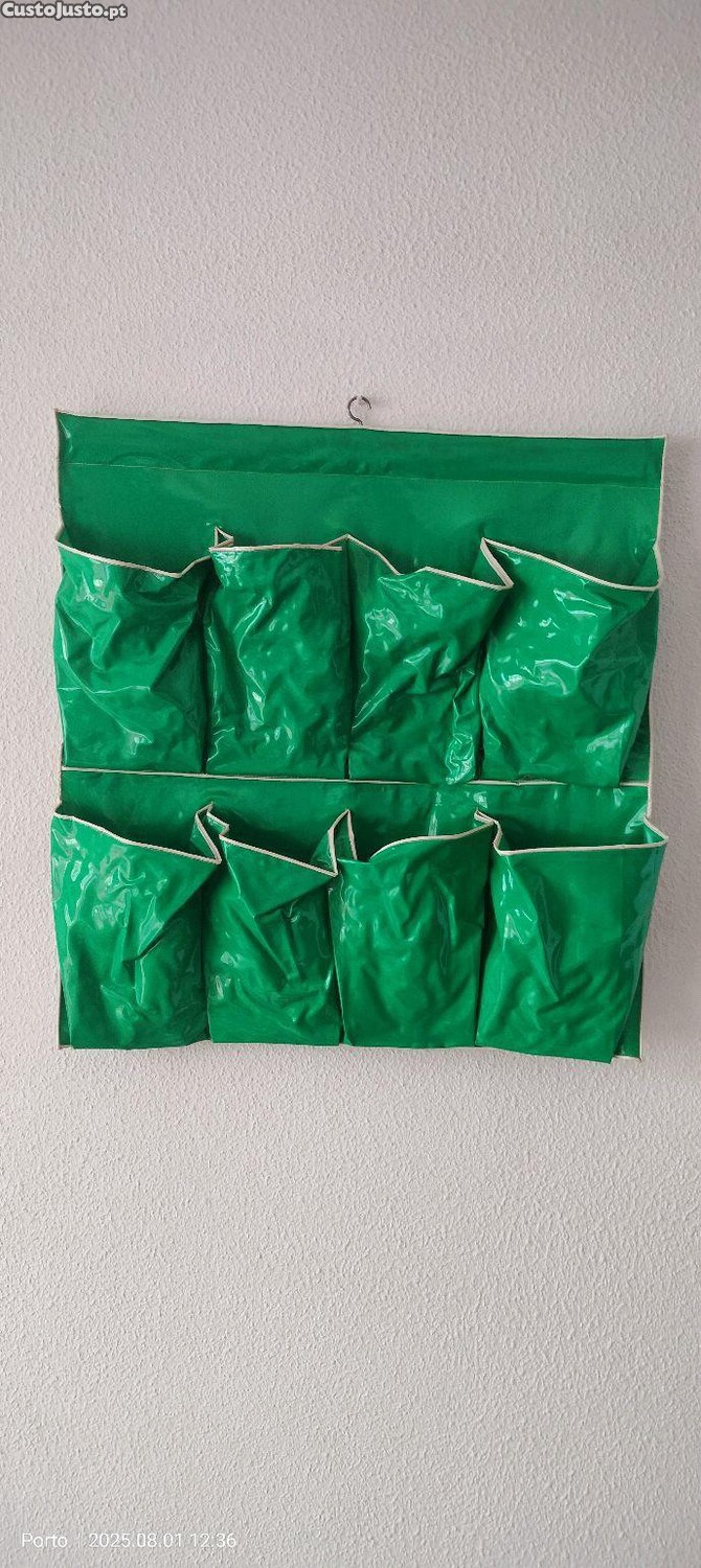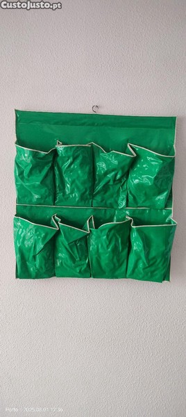 Organizador de parede com 12 compartimentos em material resistente e impermeável, com detalhes em madeira (não visível mas fotografias)