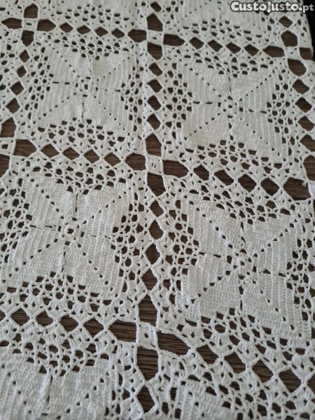 Toalhas em croché feitas à mão. Uma retangular branca com o preço de 15EUR. A outra beje com o preço de 10EUR