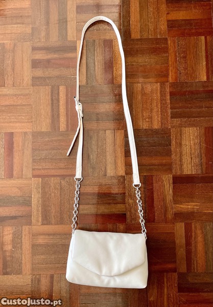 De cor branca. Tecido semelhante a pele. De formato aproximadamente retangular, esponjoso ao toque. Alça de ombro com corrente metálica prateada. Alça não removível mas de tamanho ajustável com cinto. Sem protetores no fundo.