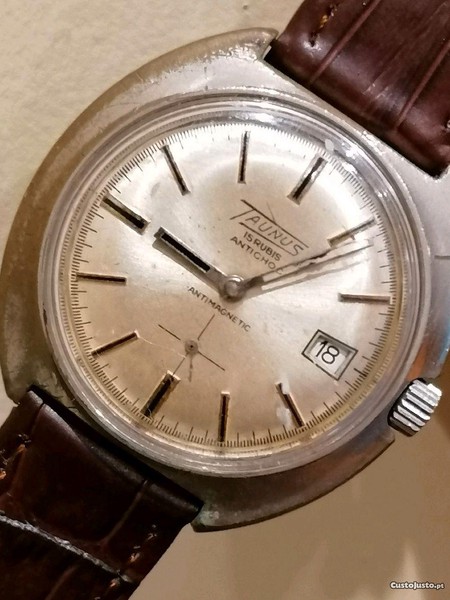 Relógio antigo corda manual taunus, sinais dos anos e do uso. A funcionar, contudo desconheço última manutenção. Vendido tal como se encontram.ver fotos e estado. .poderei trocar por outro colecionável desde que tenha um valor aproximado de quarenta e cincoeuros