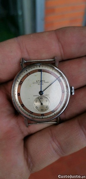 80 euros. Relógio antigo corda manual stuag la chaux de fonds suisso anos 40, mostrador duplo tom.movimento a trabalhar e a manter o tempo, desgaste da caixa pelo rebordo superior, vendo ou troco por relógio antigo homem corda manual desde que seja do meu agrado e teria que ter um valor aproximado de oitenta euros. ver fotos e estado.