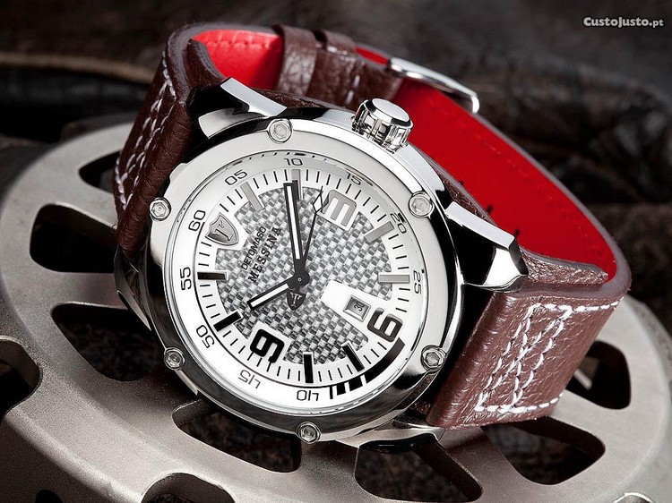 Mecanismo CITIZEN, Miyota calibre 2115 (alta precisão). Ponteiros luminescentes. Caixa de aço. Mostrador de carbono, prateado. Bracelete de pele genuína, exteriormente de cor castanha, pespontada a branco e, do lado interno, de cor vermelha. Fivela com o respectivo logotipo. Vidro mineral resistente aos riscos. Resistente à água: 10 ATM.