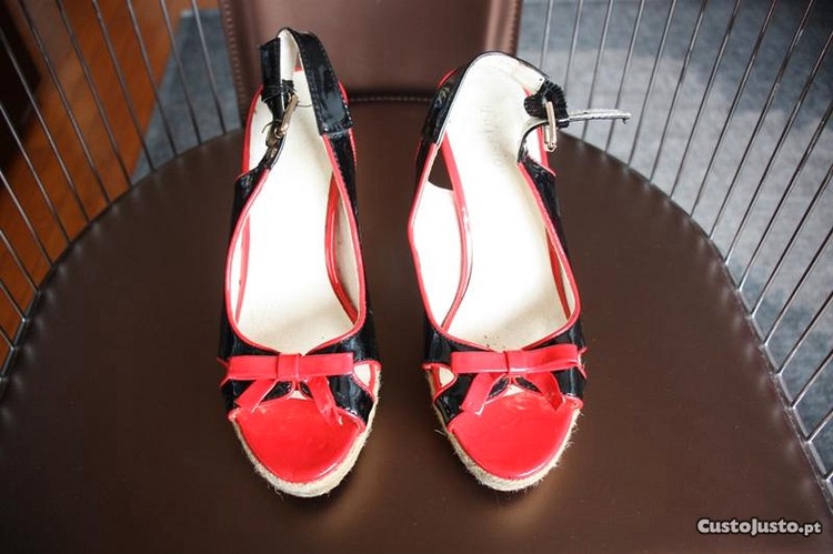Sandálias de verniz preta e vermelha da marca FARASION. O Tamanho é o 36 mas calça certamente 37, claro está, que depende do pé. Tacão de 12 cm que inclui 3 cm de compensado.