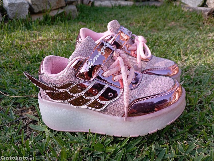 Sapatilhas número 31, em segunda mão, como novas. Aplica-se uma roda e outra sai de uma tampinha diretamente da sola. Com luzes com carregamento USB através de um cabo escondido na zona do velcro.