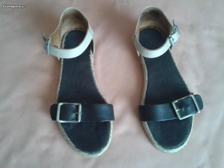SAPATOS tipo sandália em pele genuina, para senhora tam 35 - modelo de aperto com fivela - cor beje c/tira castanha e fivela acabamento tipo corda no rebordo entre palmilha e sola.