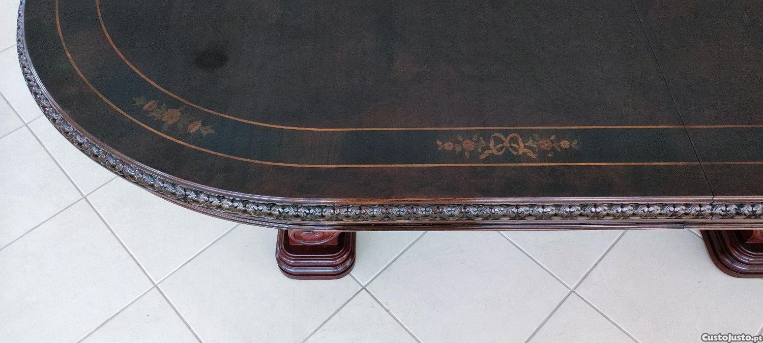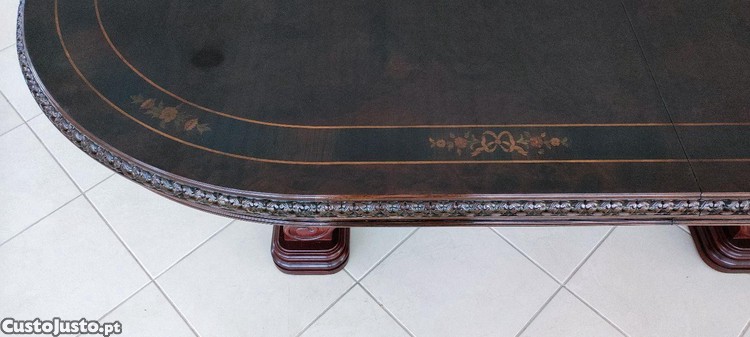 Mesa de jantar oval em madeira com talha e maquetaria, com 2 extensões de 40cm cada.