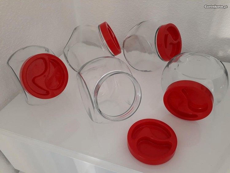 5 frascos em vidro com tampa de plástico, para rebuçados ou outros ingredientes ou produtos.