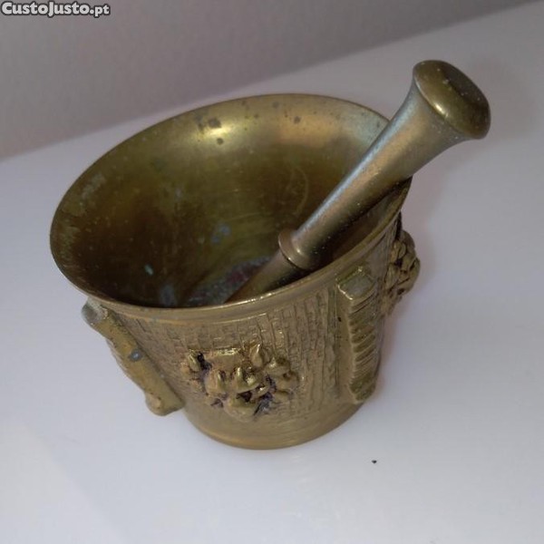 Almofariz com pilão, em bronze, do século XX e decoração de quatro cabeças de leão.
