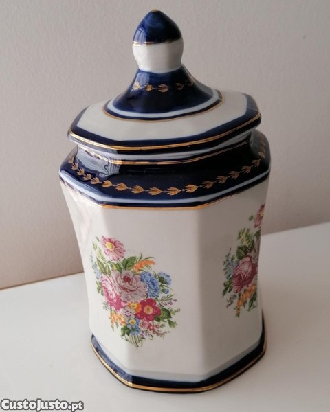 Caixa de chá com tampa em porcelana "PorCeNor", tipo Limoges, oitavada, pintada à mão com decoração policromada floral.