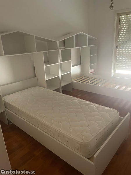 Conjunto cama 90/190 branca com estante + estrado e colchão.