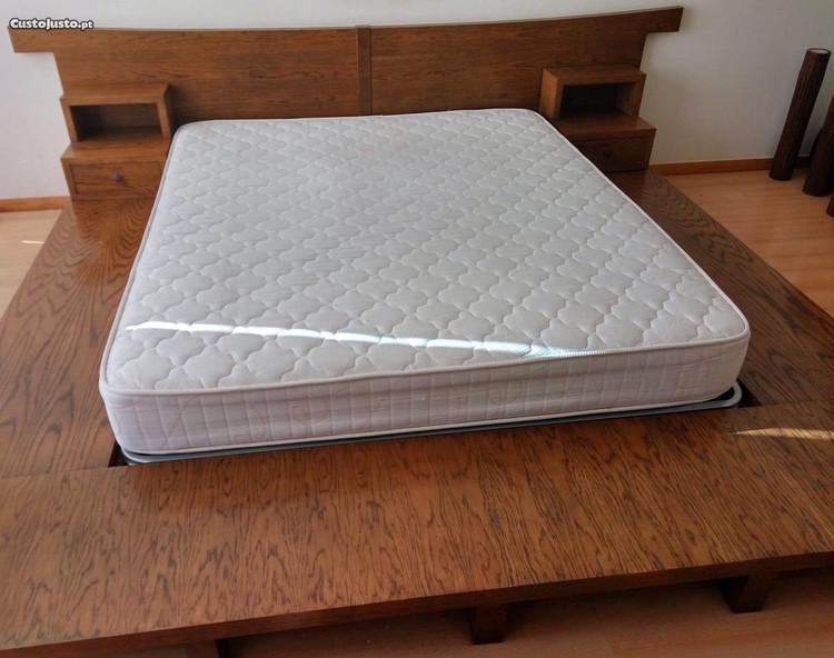Estrutura de cama medidas: largura total 2,83m comprimento 2,42m altura total maxima 79cm espessura tábuas 5cm Mesinhas que pousam na cama: 40cm largura 35cm profundidade Comoda 1,76m largura 38cm profundidade Carvalho com veios pretos. Como nova. Acessórios, colchão e estrado não incluídos.