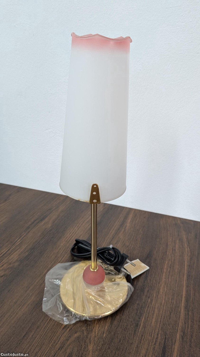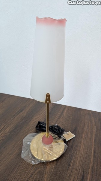 Esta é uma lâmpada de mesa cilíndrica com base e haste douradas com um abajur de vidro fosco com um detalhe rosa na borda superior.