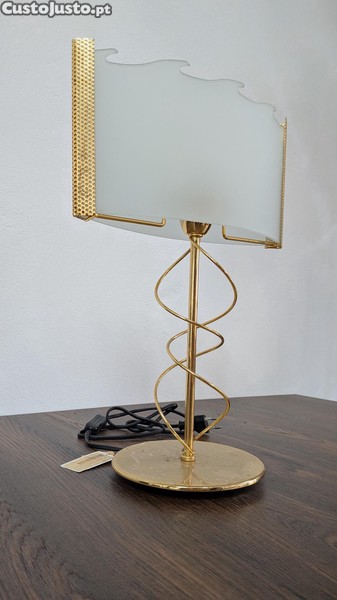 Este é um candeeiro de mesa dourado com uma base redonda e um abajur retangular banco, apresentando um design de espiral na haste.
