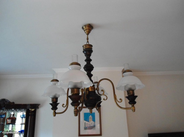 Modelo : Candeeiro de sala com 4 braços . Em latão e madeira . Da fabrica de candeeiros da Maiarte - Excelente qualidade .