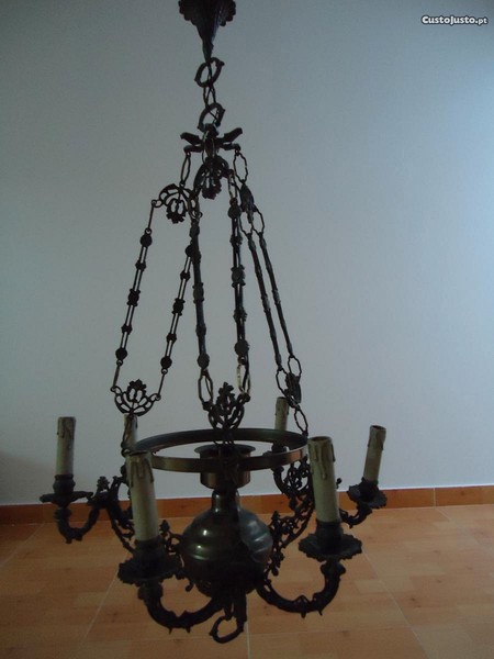 Candeeiro de tecto, grande,com cerca de 50 cm de diâmetro, sem campânula de vidro, com 7 lâmpadas (6 "velas" e uma central).
